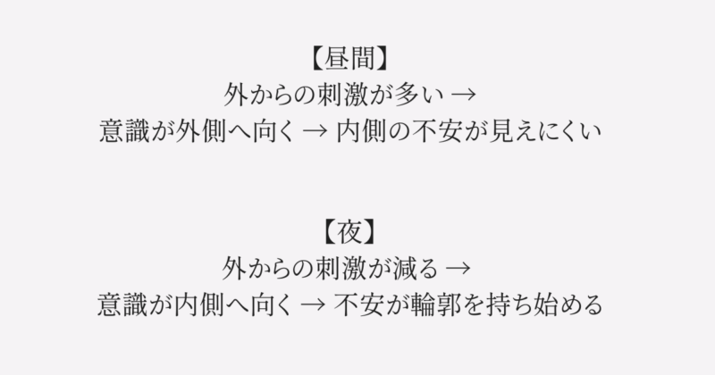 さらに夜は、疲労も重なります。疲れた脳は思考をコントロールする力が落ちるため、不安がより鮮明に感じられやすい。