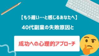 副業の始め方 【もう遅い…と感じるあなたへ】40代副業の失敗原因と成功への心理的アプローチ 副業で失敗したくない40代へ。副業初心者が陥りやすい6つの失敗と、その攻略法を解説します。副業歴6年の私が、何度も挫折しながら学んだ“失敗を成功に変えるリアルな方法”をお伝えします。 2024.06.08 副業の始め方副業